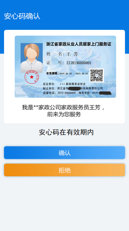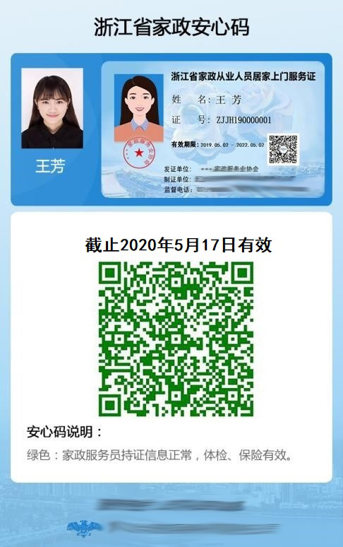 “安心碼”(或“居家上門服務(wù)證”)是浙江省家政從業(yè)人員從事家政服務(wù)工作的重要憑證,包含家政從業(yè)人員所屬企業(yè)相關(guān)信息、個(gè)人基本信息、體檢合格信息、從業(yè)責(zé)任保險(xiǎn)信息、公安部門違法犯罪背景核查結(jié)論信息等多項(xiàng)從業(yè)安全信息數(shù)據(jù)。聘用持證家政從業(yè)人員進(jìn)行家政服務(wù)的消費(fèi)者,可查驗(yàn)家政從業(yè)人員基本信息和其他相關(guān)信用信息,以及依托政府、家政行業(yè)協(xié)會(huì)等機(jī)構(gòu)咨詢、維權(quán)等。