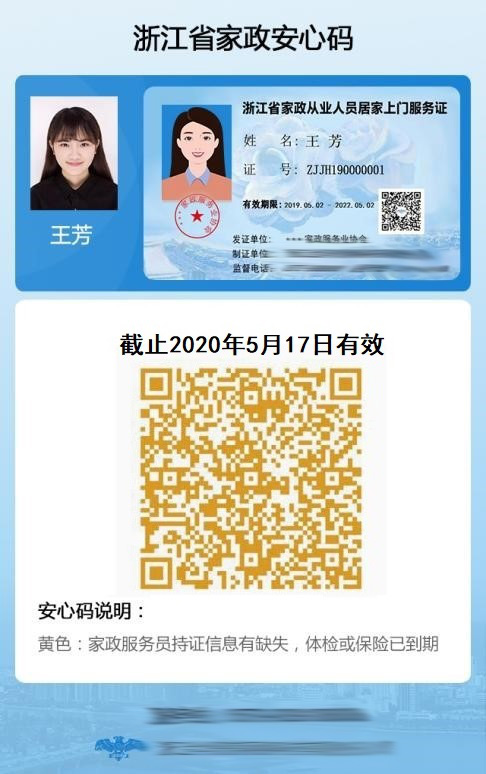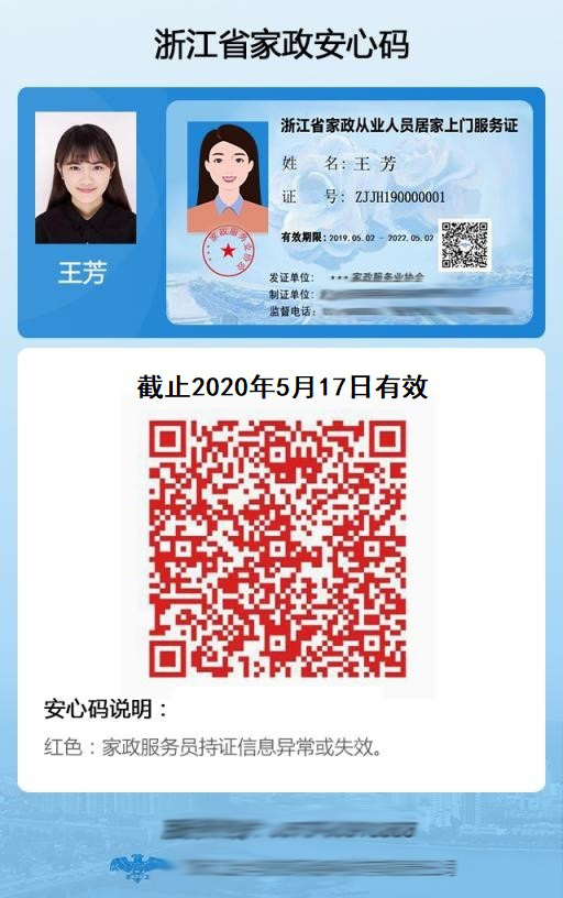 浙江省家政“安心碼”采取全省統(tǒng)一格式、各市分別制作、授權(quán)省市家政行業(yè)協(xié)會(huì)發(fā)放的形式推廣實(shí)施。為兼顧部分不適應(yīng)使用線上碼家政從業(yè)人員需求,允許備份使用“居家上門服務(wù)證”。“碼”與“證”具有同等效力,具體樣式詳見(jiàn)附件1。相關(guān)機(jī)構(gòu)在生成家政“安心碼”的同時(shí),即同步生成線上“居家上門服務(wù)證”,由家政從業(yè)人員自行決定是否制作線下實(shí)體證。